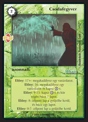 Csodafegyver (8): Jópofa papír. A kiszámíthatatlansága miatt nem tartom igazán versenyerősnek, pedig jó dolgokat csinál. Szélsőséges esetekben nagyon erős tud lenni, sajnos elég nehéz úgy intézni, hogy pont annyi ÉP-ben legyen az ellenfél. Az egészben a legrosszabnak a counterelős részét tartom, a játék elején, amikor még vélhetőleg sokban lesz az ellenfél, akkor nem lesz annyira jó 2 VP-ért counterelni. De ha már sebeztünk négyet, akkor igen jól fogunk járni. Kicsit később cantrip manatermeléssé válik; nem rossz, nem rossz, de mennyivel jobb lenne, ha fordítva lenne a counterelés és a manatermelés. A vége felé leszedésként fog funkcionálni, kiiktathatjuk vele az ellenfél védelmét. Bevallom nekem jobban tetszene, ha direktsebzésként működne akkor.