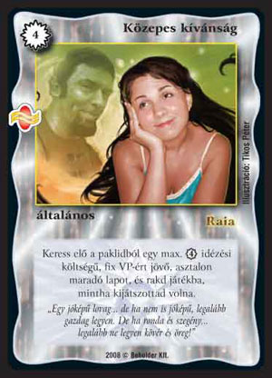Közepes kívánság (8): Az Apró kívánság népszerűségét próbálja meglovagolni ez a lap, sajnos nem eléggé sikeresen. Kétségtelen, hogy ingyen lapot keresni még mindig elég jó, de azért nem mindegy, hogy mennyit fektetünk ebbe az akcióba. Mivel többnyire lényt fogunk előkeresni, nagy probléma, hogy támadható felületet nyújtunk a countereknek, s igen nagy gond van, ha 1-2 VP-ért lecounterelnek. Azért Lassan járj! pakliba ne féljünk használni.