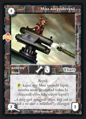 Moa torpedó (8): Elsőre nagyon durvának tűnik. Egy VP-ért ötöt sebezni... ilyen még nem (nagyon) volt. Sajnos nem lehet bedobni, csak a következő körben; ez azért jócskán tompít az élén, nem is gondolná az ember, mennyire. Ha a játék elején lerakjuk, akkor nyilván csak az alkalmat fogjuk lesni, amikor bevethetjük, de ekkor nyilván az ellenfél már eleve számít rá, illetve tudja, hogy kisebb az esély arra, hogy a kézben lévő lapjainkkal bezavarhatunk a játékába (kevesebb lap, kisebb baj). Ugyanígy probléma, ha a kritikus pillanatban nem tudjuk még bevetni, csak akkor, amikor már lehet, hogy késő lesz. Turbógyors, az ellenfél gyors szétalázására épülő paklikba azért még bőven helyet kaphat.
