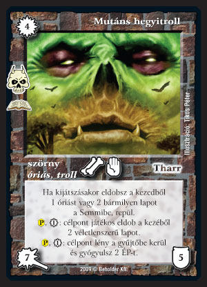 Mutáns hegyitroll (7): Korrekt árú, combos lény. A mai korszellemmel szemben próbál haladni - ugyanis nem repül. Így már erőteljesen csökken az érdeklődés iránta, hiába késztethetjük "némi" áldozatok árán repülésre. Legérdekesebbnek benne a háromfajta felhasználását tartom. Igaz mindegyikre van már egy jobb alternatíva, de a sokoldalúság mindig egy nagy jó pont egy lapnál. Ráadásul még van egy altípusa is, amire építhetünk. Igaz kissé kevés óriás jelent meg mostanság, s a többi gyengébb ennél, de azért érdemes lehet vele próbát tennünk. Lépéselőnyös óriás pakliban akár az első körben rárepülhet az ellenfélre.