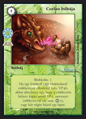 Corlan bűbája (8): A blokkolásnak immáron egy elég jó alternatív haszna lesz - mindegyik erőforrássá válik. Nyilván keményen blokkoló pakliban érdemes használni, ahol gyorsan kipöröghetnek a lapjaink, s az sem okoz problémát, ha nem húzzuk fel a bűbájt. Igaz, hogy blokkolni mellette nem annyira fogunk, viszont sokkal jobban pörög a paklink, aminek ugyanaz lesz a vége - gyorsan leblokkoltuk az ellenfelet.