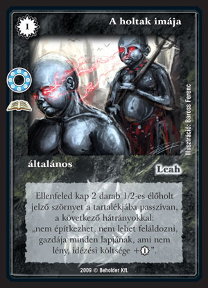 A holtak imája (7):Elsőre meghökkentően erősnek tűnik, de azért be kell látni, hogy igazából nem termel akkora előnyt, mint szeretnénk. A két manás drágítás nagyon jól hangzik, de ebből le kell vonni azt a plusz VP-t, amit a tartalékban lévő lények termelnek. De az ellenfél akár üthet is velük, ami azért hosszú távon mindenképpen kellemetlen. Ha lényekkel szeretnénk nyerni, akkor problémás lehet, hogy az ellenfél bármikor beterel két lényt az őrposztba. Ha használjuk, ne feledjük, hogy az ősmágiás lapjait is drágítják, mert a hátrányra nem vonatkozik az ősmágia.