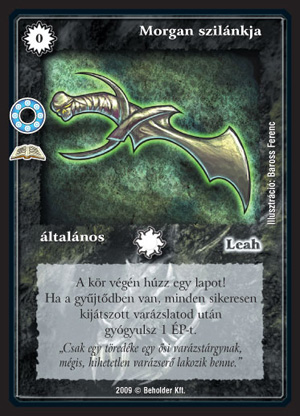 Morgan szilánkja (7): Mit kezdjek egy ilyen lappal? Annyira kis semmi dolgot csinál - igaz pontosan semmibe se kerül. Az a probléma, hogy ez a csöpp kis előny nem éri meg, hogy egy Zarknod börtöne ellen tökéletesen használhatatlan legyen, vagy rossz pillanatban húzzuk fel és a tempóhátrány miatt kikapjunk. Olyan pakliban tudom elképzelni, ahol a paklinkat dobatjuk (vízió), vagy kézből el tudjuk dobni valaminek.