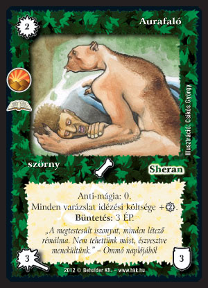Aurafaló (8): A varázslat szívatásból nem lehet elég sosem. Ez szerintem rendben is van, hiszen még mindig igen gyakran nyerik meg a versenyeket varázslatokra épülő paklikkal. Az ára korrekt, a drágítása is jó. A counterelhetetlensége zseniális, egyedül az ÉP-jével nem vagyok kibékülve, pont összeveri egy Kurtz... Bár legalább ő is vele megy. Bosszantó, hogy egy 3/3-as lénnyel csak félve tudunk ütni, de az is igaz, hogy 4-5 manájába került az ellenfélnek megszüntetni. Azért az se kutya.