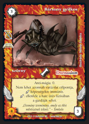 Bársony gyilkos (7): Tesztelésen többen szerették ezt a lapot (a pontszámba ezt is belevettem), én bevallom, annyira nem érzem. Kontroll lényként lehet használni, de én nem cserélném le Trok Rakont rá, ahhoz túl keveset üt, és a védelme sem az igazi. Ha sikerül ravasz tervünk, és a téli kiegészítő után jóval több lényes pakli lesz a versenyeken, akkor nagyobb szerephez juthat, mert az őrposztból tényleg jól takarít. Börtönbe, bilincsbe beférhet, mint olyan lap, ami biztos nem lesz blank, ha felhúzod. Csúnya, nagyot ütő, életes éjfattyak ellen nem rossz.