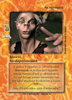 G'inyob (8): Kedvenc Bonyi G.-nk nyilván a Kragoru paklit segíti. Felvethetnénk rögtön 3 problémát is: hogyhogy csak ennyit tud, miért Rhatt, és miért nem jó Lassan járj!-ba? Nos, valóban csak üt, de azt elég hatékonyan. Első körben 1 ilyen, második körben még kettő, és game over és még pont van 2 nullás counterem, ha gonoszkodnál. A Kragorut eléggé meg tudja szottyasztani, ha leszedik a követőt, erre is van válasza, ilyenkor jöhet igazán jól rezisztenciája is. Ha pedig megvan a követőnk, az ütés után úgyis szolgálhat leszedésként is. A téma szakértője szerint a Rhatt jó (lenne) Kragoruba, mindenesetre a téli kiegészítőre terveztem még egy Rhatt mágikus védelmű lényt. Én még emlékszem, hogy a Kragoru paklit akár Lassan járj! nélkül is össze lehet rakni, nyilván counterek és egyéb spoilerek segítségével. A tesztelésen kipróbáltam, és egészen jól működött (sokat segített ebben a következő lap). A legkomolyabb ellenszer a követő leszedése volt, akár alapból is meg lehet lepni az ellenfelet Csodatevő Fenyő Zoárddal, nem fog örülni. Kragoruba, ha befér a Rhatt szín, hármat használnék belőle, és én még kalandozós pakliba is beraktam kettőt, a leendő kalandozós követő 1 VP-vel olcsóbbít, tehát mindenképp kettőért jön, többször volt jó kivégzésnek követő leszedés után.