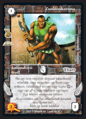 Zsoldoskatona (8): Ez bizony a megfelelő pakliban sokkal jobb, mint a Cyron, amit még használgatnak kalandozókhoz. Olcsóbb, több mindent tud, egyből húz. A hátrány, hogy nem-végzetúr kalandozókra működik csak, de az új követővel és jó pár, a közeljövőben kijövő lappal ez nem lesz túl nehéz. De ha csak saját magára sül ki, már az sem rossz.
