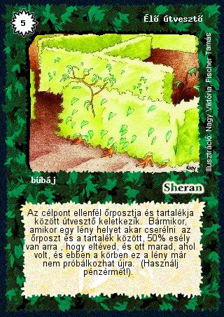 Kiadás: Alappakli, 1. kiadás, Alappakli, 2. kiadás, Alappakli, 3. kiadás, Alappakli, 4. kiadás Gyakoriság: ritka Lapszín (isten): Sheran Típus: bűbáj Szöveg: Az célpont ellenfél őrposztja és tartalékja között útvesztő keletkezik. Bármikor, amikor egy lény helyet akar cserélni az őrposzt és a tartalék között, 50% esély van arra , hogy eltéved, és ott marad, ahol volt, és ebben a körben ez a lény már nem próbálkozhat újra. (Használj pénzérmét!). Illusztráció: Nagy Viktória, Fischer Tamás