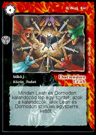 Kiadás: Isteni szövetség Gyakoriság: nem gyakori Lapszín (isten): Dornodon-Leah Típus: bűbáj Altípus: Közös Tudat Szöveg: Minden Leah és Dornodon kalandozód lép egy szintet, azok a kalandozók, akik Leah és Dornodon színűek egyszerre, kettőt. Illusztráció: Markó Gábor