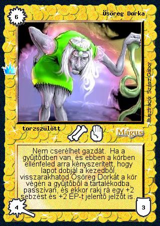 Kiadás: Ősi legendák Gyakoriság: nem gyakori Lapszín (isten): Mágus Klán Típus: torzszülött Szöveg: Nem cserélhet gazdát. Ha a gyűjtődben van, és ebben a körben ellenfeled arra kényszerített, hogy lapot dobjál a kezedből, visszarakhatod Ősöreg Dorkát a kör végén a gyűjtőből a tartalékodba, passzívan, és ekkor rakj rá egy +2 sebzést és +2 ÉP-t jelentő jelzőt is. Illusztráció: Szász Gábor