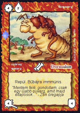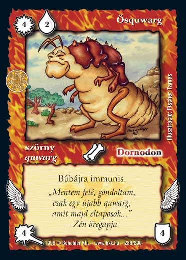 Kiadás: Ezüsthajnal, Túlélők Földje Gyakoriság: ritka Lapszín (isten): Dornodon Típus: szörny Altípus: quwarg Szöveg: Repül. Bűbájra immmúnis. Szinesítő szöveg: "Mentem felé, gondoltam, csak egy újabb quwarg, amit majd eltaposok..." - Zén öregapja Illusztráció: Fischer Tamás