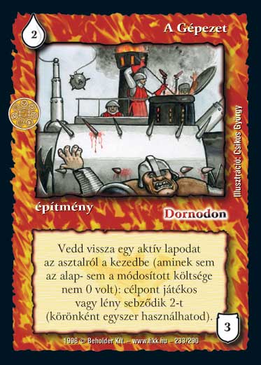Hatalom Kártyái kártyalap - A Gépezet| (AK35) A Gépezetet nem játszhatom ki Morpetlanik darujával, mivel A Gépezet idézési költsége - annak ellenére, hogy épület - nem építő, hanem áldozás. | | (AK36) A Kísérteties bajnokkal visszahozott lény minden szempontból normálisan viselkedik, kivéve, hogy a kör végén mindenképpen a gyűjtőbe kerül, de csak akkor, ha még az asztalon van. Ha valamilyen hatással (pl. A Gépezet) visszaveszem a kezembe, akkor már nem tud a gyűjtőbe kerülni. | | (AK37) A Gépezet szövege hibás. A helyes szöveg a "Vedd vissza egy aktív lapodat az asztalról a kezedbe" helyett a "Egy aktív lapod az asztalról visszakerül a tulajdonosa kezébe". Tehát, ha például elbűvölöm az ellenfél lényét, és azt használom A Gépezethez, akkor a lény az ellenfelem kezébe kerül vissza. | | (AK53) Visszavehetem a Trükkös csellel saját magát (ld. A Gépezet). Az ellenfél lapjait pedig ő választja ki. | | (AK56) Visszavehetem A Gépezettel a Templomi orgonát, ha ingyen játszottam ki, mivel volt egy templomom játékban. A Gépezettel nem vehetsz vissza olyan lapot, aminek az idézési költsége 0. Ez azonban az alap idézési költségre vonatkozik, ami az orgonánál három. A Templomi orgonának csak a módosított idézési költség 0, mivel a templom csökkenti a kijátszási költségét. |
