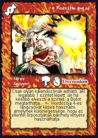 Szöveg: Csak olyan kalandozónak adható, aki legalább 1 szintet lépett, de ha később elveszti a szintet, a Botot megtarthatja. +-: Hordozója 4-es lángcsóvát képes használni, amelynek különlegessége, hogy az ellenfél őrposztjának bármely lényére használhatja.