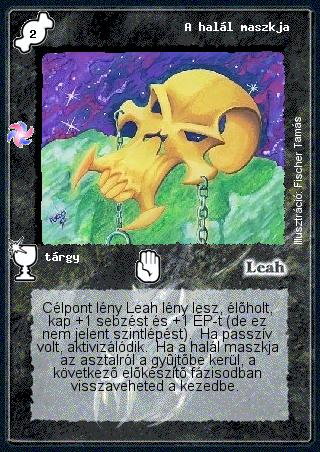 Szöveg: Célpont lény Leah lény lesz, élőholt, kap +1 sebzést és +1 ÉP-t (de ez nem jelent szintlépést). Ha passzív volt, aktivizálódik. Ha a halál maszkja az asztalról a gyűjtőbe kerül, a következő előkészítő fázisodban visszaveheted a kezedbe.