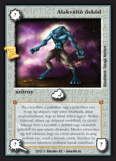 Szöveg: Ha a kezedben, a paklidban vagy a gyűjtődben van, és egy lap altípusra vagy színre hivatkozik, akkor meghatározhatod, hogy az ősköd milyen legyen. Amikor kijátszod, válassz egy altípussal rendelkező, fix idézési költségű lényt a kezedből, a játékból vagy valamelyik gyűjtőből (ez nem számít célzásnak). Minden tekintetben úgy kell tekinteni, hogy ezt a lényt játszod ki, és amíg játékban van, ennek a lénynek számít. Veszélyes faj versenyen bármilyen etnikumú lapnak számítható. Veszélyes faj versenyen bármilyen etnikumú lapnak számítható.