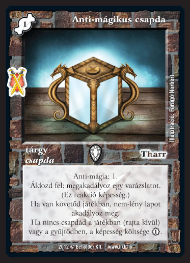 Szöveg: Anti-mágia: 1. Áldozd fel: megakadályoz egy varázslatot. (Ez reakció képesség.) Ha van követőd játékban, nem-lény lapot akadályoz meg. Ha nincs csapdád a játékban (rajta kívül) vagy a gyűjtődben, a képesség költsége 1_VP.