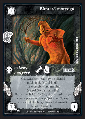 Kiadás: Kreátor műhelye Gyakoriság: nem gyakori Lapszín (isten): Leah Típus: szörny Altípus: motyogó Szöveg: Kijátszásakor nézd meg az ellenfél paklijának felső 5 lapját (ha kevesebb van, annyit), és rakd őket a Semmibe! Ha nem volt köztük 2 egyforma, akkor egy célpont permanens a gyűjtőbe kerül, vagy ellenfeled eldob egy általad választott lapot a Semmibe. Illusztráció: Juhász Ernő