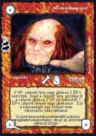 Kiadás: Rúvel hegy, Alappakli, 7. kiadás (Ősök Városa) Gyakoriság: nem gyakori Lapszín (isten): Tolvaj Klán Típus: galetki Szöveg: 3 VP: célpont lény vagy játékos 2 ÉP-t sebződik, majd a célpont lény gazdája ill. a célpont játékos 2 VP-ért sebezhet 1 ÉP-t célpont lényen vagy játékoson. Ezt a képességet egy körben max. háromszor használhatod. Szinesítő szöveg: "A szint boszorkánymesterétől számos szolgálatot vásárolhatsz, de az ár, amit kér, néha túl bizarr." Illusztráció: Farkas László Tervező: Juhász Attila