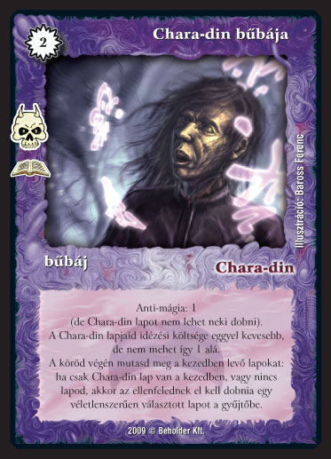 Szöveg: Anti-mágia: 1 (de Chara-din lapot nem lehet neki dobni). A Chara-din lapjaid idézési költsége eggyel kevesebb, de nem mehet így 1 alá. A köröd végén mutasd meg a kezedben levő lapokat: ha csak Chara-din lap van a kezedben, vagy nincs lapod, akkor az ellenfelednek el kell dobnia egy véletlenszerűen választott lapot a gyűjtőbe.