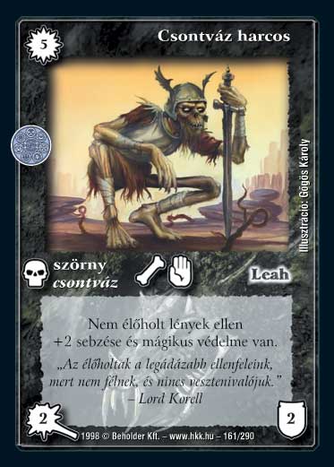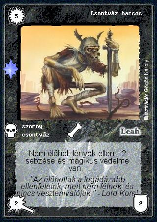 Kiadás: Ezüsthajnal, Túlélők Földje Gyakoriság: nem gyakori Lapszín (isten): Leah Típus: szörny Altípus: csontváz Szöveg: Nem élőholt lények ellen +2 sebzése és mágikus védelme van. Szinesítő szöveg: "Az élőholtak a legádázabb ellenfeleink, mert nem félnek, és nincs vesztenivalójuk." - Lord Korel Illusztráció: Gőgös Károly