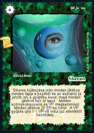 | (AK16) A Déja vu hatására, a Világégéshez hasonlóan, minden a játékban levő lap a gyűjtőbe kerül. A Gyevi bíróra azonban nem hatnak a lények egy csoportjára vonatkozó lapok, ezért a Déja vu és a Világégés ellenére is játékban marad. A Tárgyvédelem megvédi a tárgyat amelyen van, így a Tárgyvédelem leesik, de a tárgy nem. A Bűbájvédelemmel hasonló a helyzet. | | (AK18) Az azonnali reakció varázslatok előbb létrejönnek mint az a varázslat amire reagálnak (ld. Ellenvarázslat, Manacsapda). Tehát ha a Déja vumet, vagy a Tudati vitalizációmat manaégetik, akkor először végrehajtódik a Manaégés, azután gyógyulsz a vitalizációtól vagy jön a Déja vu. | | (AK20) Ha a Pozitív létsík játékban van, akkor is ki lehet játszani ezeket a lapokat (pl. Árvíz), illetve, ha bűbáj (pl. Influenza, Éhínség) vagy más az asztalon maradó lap (pl. Uman szelleme), akkor azok játékban maradnak, csak semmilyen hatásuk nem lesz. Megmarad még azonban az a kérdés, hogy mi van az olyan lapokkal, melyeknek több hatásuk is van, a lények elpusztítása mellett mást is csinálnak (pl. Az igazság pillanata, Déja vu). Ezeket a lapokat is ki lehet játszani, de abban az esetben, ha csak egy lényt is a gyűjtőbe küldenének, a lap teljes hatása nem jön létre, tehát a Déja vunál nem kezdődik elölről a játék, Az igazság pillanatánál az ellenfél nem veszíti el a varázspontjait, és nem esik le egy bűbája stb. A Végelgyengülés más eset. Ezt is ki lehet játszani a Pozitív létsík mellett, és folyamatosan csökkenti a lény ÉP-jét egyig, egynél azonban megáll, és nem öli meg a lényt. | | (AK23) A Déja vunél a lapok egyszerre kerülnek a gyűjtőbe, ezért az Agyaggalamb nem mentheti meg egy másik tárgyadat. | | (AK28) A Kristálypraglonc egy lény, annak ellenére, hogy szörnykomponensből kell kijátszani. Azaz minden varázslat és hatás, amely egy adott lényre hat, az a pragloncra is hat, két kivétellel. Az első, hogy a sebző varázslatok és hatások 0-át sebeznek rajta. Vagyis rá lehet lőni a Tisztítótüzet, bele lehet parittyázni, meg lehet ütni lényekkel, de a sebzés minden esetben 0 lesz. A második kivételt pedig az olyan varázslatok és hatások jelentik, amelyek gyűjtőbe küldenek egy-egy lényt (pl. Járvány, Uman szelleme), vagy a játékból kiraknak (pl. Elimináció, Élőholt mágus, Kiűzetés) lényeket. Ezeket is lehet a pragloncra használni, csak semmilyen hatásuk nincs rá. Tehát lehet rá használni a Sötét kastplomot, és a kastplomjelzők erősítik is, meg lehet idézni Nagyobb idézéssel (ez esetben, ha játékban akarom tartani, ki kell fizetni mind az öt komponenst, a -2 VP itt értelmezhetetlen). A tárgyakra vonatkozó hatások és varázslatok viszont csak akkor hatnak rá, ha az a varázslat vagy hatás a gyűjtőbe küldi a tárgyat, azaz jelen esetben a pragloncot (pl. Gigaököl, Unkreáció). A többi tárgyra ható varázslatnak és hatásnak (pl. Ferratáció, Lopás szakértelem, Gnóm mágus) semmi hatása nincs a pragloncra. A lapokra illetve lapok egy csoportjára ható varázslatok és hatások (pl. A gyenge pusztulása, Déja vu, Apokalipszis, Kisebb kívánság, Teljes fordulat stb.) korlátozás nélkül kifejtik hatásukat a Kristálypragloncra. A Vulkánkitörés, a Savhurrikán és a hasonló varázslatok a lények egy csoportjára hatnak, és mivel a lények is lapok, ezért ezek is beleesnek a "lapok egy csoportjára ható" varázslatok kategóriájába, azaz ezek is leszedik a pragloncot. | | (AK33) A Déja vu hatására mindenki eldobja a kezében levő lapjait, és húz öt lapot, valamint mindenki elveszti a VP-jét, és a VP-gyűjtés újra egyről indul. Egy Déja vu kijátszása azonban nem eredményezi a játék újrakezdését, és A bőség zavara azt mondja, hogy "minden játékos a játék kezdetekor +3 lapot húz". Tehát A bőség zavaránál továbbra is öt lapot lehet húzni a Déja vu után. A Manaforrás hatása, hogy a kör elején kapott VP nem ötig, hanem nyolcig nő, nem ütközik a Déja vu hatásával. Vagyis a Déja vu után először mindenki egy VP-t kap, majd ez folyamatosan felnő nyolcig. | | (AK58) Megmenti a Déja vutól a lényemet a rajta levő D.E.M.. Éppúgy, ahogy a Tárgyvédelemről és a Bűbájvédelemről azt mondtuk, hogy megmentik az adott tárgyat és bűbájt, a D.E.M. is megmenti a lényt. | | (AK91) Ellenfelem Védelmező rakshallionnal játszik, kint van négy lénye az asztalon és én kijátszok egy Déja vu -t. Hány életpontom lesz a varázslat létrejötte után? 8 ÉP-d lesz. Az a szabály, hogy először létrejön a teljes varázslat hatása, majd ezután következnek az olyan dolgok, amik a varázslat miatt az egyéb asztalon levő lapokból származnak. Mint pl. a büntetés is. | | (AK95) 40 életpontunk lesz, ha páros versenyen, valaki kijátszik egy Déja Vu-t. Valójában a párosban a közös életpont a két játékos együttes életpontja. Ha ? a Déja Vu szövege szerint ? mindketten 20-ba kerülnek, akkor együtt 40 életpontjuk lesz.