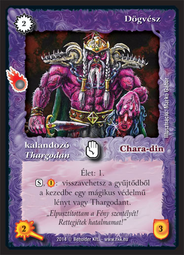 Kiadás: Mágusok Alkonya Gyakoriság: nem gyakori Lapszín (isten): Chara-din Típus: kalandozó Altípus: Thargodan Szöveg: Élet: 1. (S), (1): visszavehetsz a gyűjtődből a kezedbe egy mágikus védelmű lényt vagy Thargodant. Szinesítő szöveg: "Elpusztítottam a Fény szentélyét! Rettegjétek hatalmamat!" Illusztráció: Markó Gábor