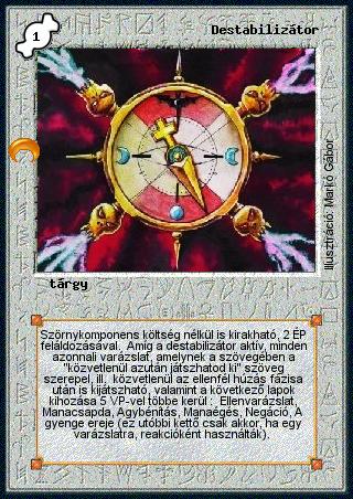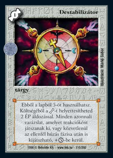 Kiadás: Chara-din visszatér, Túlélők Földje Gyakoriság: nem gyakori Lapszín (isten): Színtelen Típus: tárgy Szöveg: Szörnykomponens költség nélkül is kirakható, 2 ÉP feláldozásával. Amíg a destabilizátor aktív, minden azonnali varázslat, amelynek a szövegében a "közvetlenül azután játszhatod ki" szöveg szerepel, ill. közvetlenül az ellenfél húzás fázisa után is kijátszható, valamint a következő lapok kihozása 5 VP-vel többe kerül: Ellenvarázslat, Manacsapda, Agybénítás, Manaégés, Negáció, A gyenge ereje (ez utóbbi kettő csak akkor, ha egy varázslatra, reakcióként használták). Illusztráció: Markó Gábor