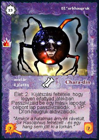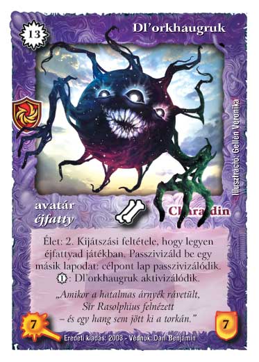 Szöveg: Élet: 2. Kijátszási feltétele, hogy legyen éjfattyad játékban. Passzivizáld be egy másik lapodat: célpont lap passzivizálódik. 1 VP: Dl'orkhaugruk aktivizálódik.