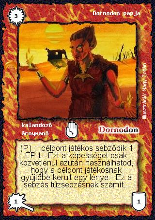 Kiadás: Chara-din visszatér Gyakoriság: gyakori Lapszín (isten): Dornodon Típus: kalandozó Altípus: árnymanó Szöveg: (P): célpont játékos sebződik 1 ÉP-t. Ezt a képességet csak közvetlenül azután használhatod, hogy a célpont játékosnak gyűjtőbe került egy lénye. Ez a sebzés tűzsebzésnek számít. Illusztráció: Nagy Zoltán