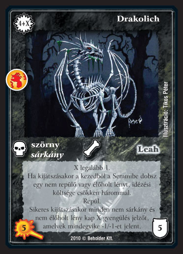 Kiadás: Örökkévalóság Gyakoriság: ritka Lapszín (isten): Leah Típus: szörny Altípus: sárkány Szöveg: X legalább 1. Ha kijátszásakor a kezedb?l a Semmibe dobsz egy nem repül? vagy él?holt lényt, idézési költsége csökken hárommal. Repül. Sikeres kijátszásakor minden nem sárkány és nem él?holt lény kap X gyengülés jelz?t, amelyek mindegyike -1/-1-et jelent. Illusztráció: Tikos Péter
