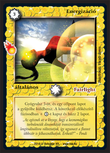 Kiadás: Mágusok Alkonya Gyakoriság: ritka Lapszín (isten): Fairlight Típus: általános Szöveg: Gyógyulsz 5-öt, és egy célpont lapot a gyűjtőbe küldhetsz. A következő előkészítő fázisodban + 5_VP-t kapsz és húzz 2 lapot. Szinesítő szöveg: "Az egésznek az a lényege, hogy a kozmomágikus turbulenciák dinamikáját transzverzálisról longitudinálisra változtatjuk, így ugyanazt a fluxust többször is felhasználhatjuk. Érthető?" - Pondi Illusztráció: Váradi János