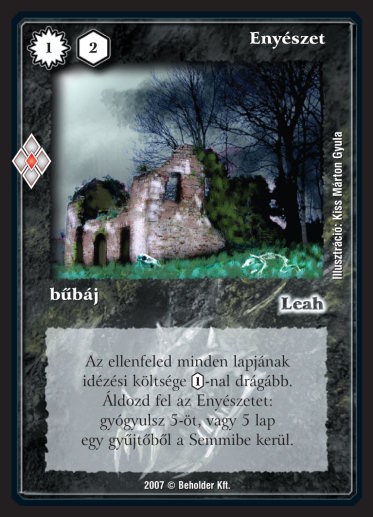 Szöveg: Az ellenfeled minden lapjának idézési költsége [1]-nal drágább. Áldozd fel az Enyészetet: gyógyulsz 5-öt, vagy 5 célpont lap egy gyűjtőből a Semmibe kerül.
