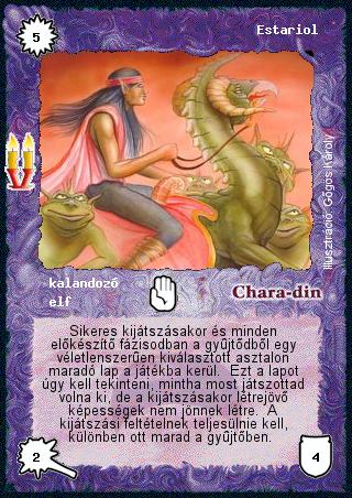 Kiadás: Régmúlt Gyakoriság: ritka Lapszín (isten): Chara-din Típus: kalandozó Altípus: elf Szöveg: Sikeres kijátszásakor és minden előkészítő fázisodban a gyűjtődből egy véletlenszerűen kiválasztott asztalon maradó lap a játékba kerül. Ezt a lapot úgy kell tekinteni, mintha most játszottad volna ki, de a kijátszásakor létrejövő képességek nem jönnek létre. A kijátszási feltételnek teljesülnie kell, különben ott marad a gyűjtőben. Illusztráció: Gőgös Károly