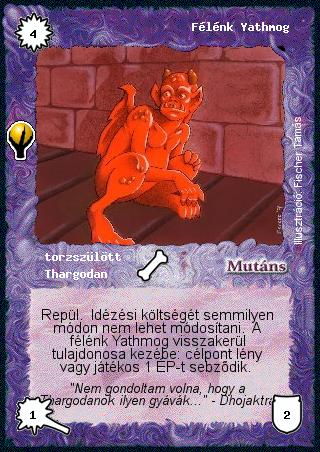 Szöveg: Repül. Idézési költségét semmilyen módon nem lehet módosítani. A félénk Yathmog visszakerül tulajdonosa kezébe: célpont lény vagy játékos 1 ÉP-t sebződik.