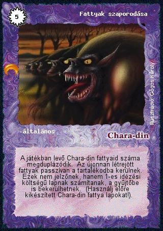 Szöveg: A játékban levő Chara-din fattyaid száma megduplázódik. Az újonnan létrejött fattyak passzívan a tartalékodba kerülnek. Ezek nem jelzőnek, hanem 1-es idézési költségű lapnak számítanak, a gyűjtőbe is bekerülhetnek. (Használj előre kikészített Chara-din fattya lapokat!).