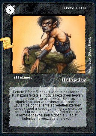 Kiadás: Alappakli, 5. kiadás (Ősök városa) Gyakoriság: ultra ritka Lapszín (isten): Halhatatlan Klán Típus: általános Szöveg: Fekete Péterből csak 1 lehet a paklidban. Kijátszási feltétele, hogy a kezedben legyen legalább 1 lap ezen kívül. Sikeres kijátszása után vedd vissza a kezedbe. Ezután célpont ellenfeled véletlenszerűen húz egy lapot a kezedből, amely a gyűjtőbe kerül. Ha ez a lap a Fekete Péter volt, az ellenfelednek fel kell áldoznia 2 lapját, különben elvesztette a játékot. Illusztráció: Gőgös Károly