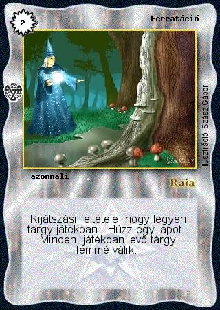 Kiadás: Isteni szövetség Gyakoriság: nem gyakori Lapszín (isten): Raia Típus: azonnali Szöveg: Kijátszási feltétele, hogy legyen tárgy játékban. Húzz egy lapot. Minden, játékban levő tárgy fémmé válik. Illusztráció: Szász Gábor