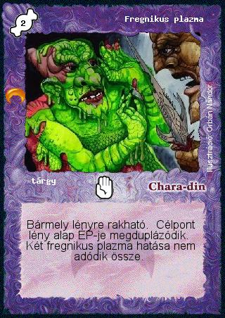 Kiadás: Chara-din visszatér Gyakoriság: gyakori Lapszín (isten): Chara-din Típus: tárgy Szöveg: Bármely lényre rakható. Célpont lény alap ÉP-je megduplázódik. Két fregnikus plazma hatása nem adódik össze. Illusztráció: Orbán Nándor