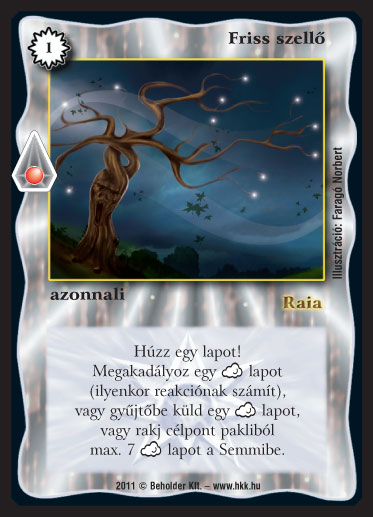 Kiadás: Zanszilánkok Gyakoriság: nem gyakori Lapszín (isten): Raia Típus: azonnali Altípus: - Szöveg: Húzz egy lapot! Megakadályoz egy _köd lapot (ilyenkor reakciónak számít), vagy gyűjtőbe küld egy _köd lapot, vagy rakj célpont pakliból max. 7 _köd lapot a Semmibe. Illusztráció: Faragó Norbert