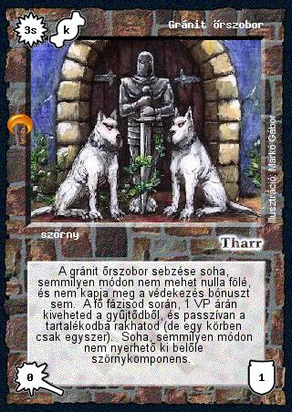 Kiadás: Chara-din visszatér Gyakoriság: ritka Lapszín (isten): Tharr Típus: szörny Szöveg: A gránit őrszobor sebzése soha, semmilyen módon nem mehet nulla fölé, és nem kapja meg a védekezés bónuszt sem. A fő fázisod során, 1 VP árán kiveheted a gyűjtődből, és passzívan a tartalékodba rakhatod (de egy körben csak egyszer). Soha, semmilyen módon nem nyerhető ki belőle szörnykomponens. Illusztráció: Markó Gábor