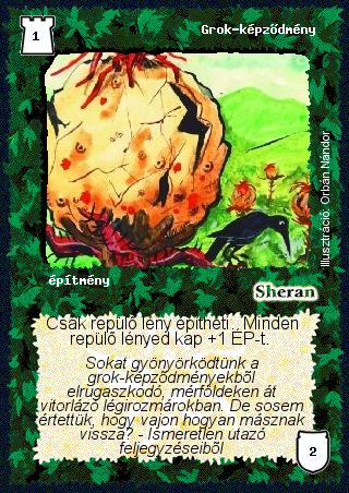 Kiadás: Alappakli, 1. kiadás, Alappakli, 2. kiadás, Alappakli, 3. kiadás, Alappakli, 4. kiadás Gyakoriság: nem gyakori Lapszín (isten): Sheran Típus: építmény Szöveg: Csak repülő lény építheti. Minden repülő lényed kap +1 ÉP-t. Szinesítő szöveg: Sokat gyönyörködtünk a grok-képződményekből elrugaszkodó, mérföldeken át vitorlázó légirozmárokban. De sosem értettük, hogy vajon hogyan másznak vissza? - Ismeretlen utazó feljegyzéseiből Illusztráció: Orbán Nándor
