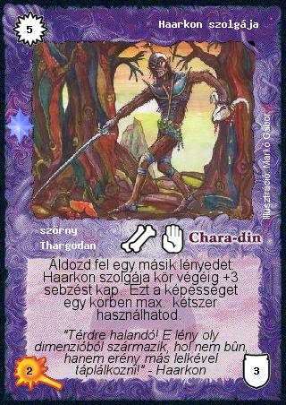 Kiadás: Ezüsthajnal Gyakoriság: ritka Lapszín (isten): Chara-din Típus: szörny Altípus: Thargodan Szöveg: Áldozd fel egy másik lényedet: Haarkon szolgája kör végéig +3 sebzést kap. Ezt a képességet egy körben max. kétszer használhatod. Szinesítő szöveg: "Térdre halandó! E lény oly dimenzióból származik, hol nem bűn, hanem erény más lelkével táplálkozni!" - Haarkon Illusztráció: Markó Gábor