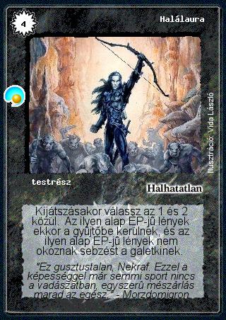 Kiadás: Két világ közt, Alappakli, 6. kiadás (Ősök Városa), Alappakli, 7. kiadás (Ősök Városa) Gyakoriság: ritka Lapszín (isten): Halhatatlan Klán Típus: testrész Szöveg: Kijátszásakor válassz az 1 és 2 közül. Az ilyen alap ÉP-jű lények ekkor a gyűjtőbe kerülnek, és az ilyen alap ÉP-jű lények nem okoznak sebzést a galetkinek. Szinesítő szöveg: "Ez gusztustalan, Nekraf. Ezzel a képességgel már semmi sport nincs a vadászatban, egyszerű mészárlás marad az egész." - Morzdomigron Illusztráció: Vida László