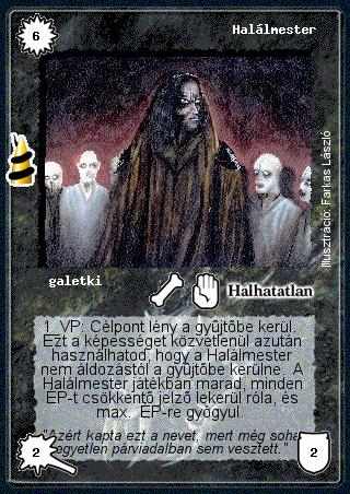 Kiadás: Rúvel hegy Gyakoriság: ritka Lapszín (isten): Halhatatlan Klán Típus: galetki Szöveg: 1 VP: Célpont lény a gyűjtőbe kerül. Ezt a képességet közvetlenül azután használhatod, hogy a Halálmester nem áldozástól a gyűjtőbe kerülne. A Halálmester játékban marad, minden ÉP-t csökkentő jelző lekerül róla, és max. ÉP-re gyógyul. Szinesítő szöveg: "Azért kapta ezt a nevet, mert még soha, egyetlen párviadalban sem vesztett." Illusztráció: Farkas László