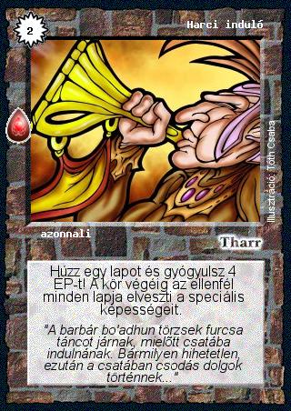Kiadás: Zu'lit kincse Gyakoriság: gyakori Lapszín (isten): Tharr Típus: azonnali Szöveg: Húzz egy lapot és gyógyulsz 4 ÉP-t! A kör végéig az ellenfél minden lapja elveszti a speciális képességeit. Szinesítő szöveg: "A barbár bo'adhun törzsek furcsa táncot járnak, mielőtt csatába indulnának. Bármilyen hihetetlen, ezután a csatában csodás dolgok történnek..." Illusztráció: Tóth Csaba