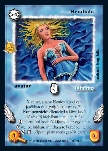 Kiadás: Hódítások Gyakoriság: ritka Lapszín (isten): Elenios Típus: avatár Szöveg: X annyi, ahány Elenios lapod van játékban és a gyűjtődben (max. 3). Kompenzáció: ellenfeled a következő előkészítő fázisában nem kap VP-t. (J): nézd meg ellenfeled kezét, és ha akarsz, kijátszhatsz onnan egy lapot 1_VP-vel olcsóbban. (S), 1_VP: célpont permanens gazdát cserél. Illusztráció: Nagy Zoltán