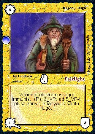 Szöveg: Villámra, elektromosságra immúnis. (P), 3 VP: ad 5 VP-t, plusz annyit, ahányadik szintű Hugó.
