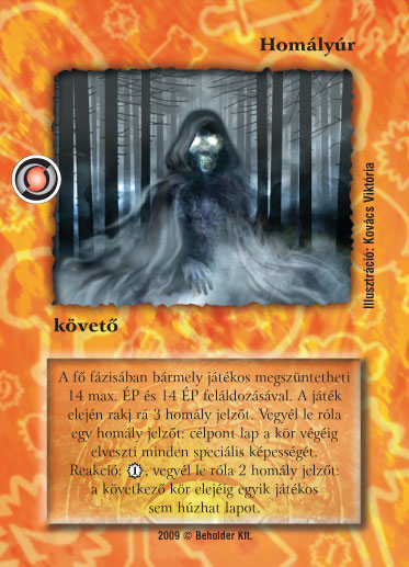 Kiadás: Elözönlés Gyakoriság: nem gyakori Lapszín (isten): Színtelen Típus: követő Altípus: - Szöveg: A fő fázisában bármely játékos megszüntetheti 14 max. ÉP és 14 ÉP feláldozásával. A játék elején rakj rá 3 homály jelzőt. Vegyél le róla egy homály jelzőt: célpont lap a kör végéig elveszti minden speciális képességét. Reakció: 1_VP, vegyél le róla 2 homály jelzőt: a következő kör elejéig egyik játékos sem húzhat lapot. Illusztráció: Kovács Viktória