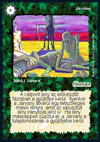 Szöveg: A célpont lény az előkészítő fázisban a gyűjtőbe kerül. Ilyenkor a Járvány átkerül egy tetszőleges másik lényre, amit az elpusztult lény irányítója jelöl ki. Ha lény másképpen pusztul el, a Járvány a tulajdonosának a gyűjtőjébe kerül.