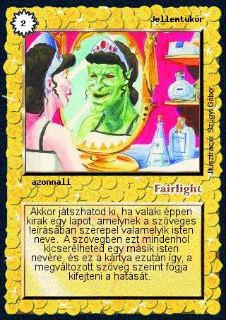 Kiadás: Alappakli, 1. kiadás, Alappakli, 2. kiadás, Alappakli, 3. kiadás, Alappakli, 4. kiadás Gyakoriság: ritka Lapszín (isten): Fairlight Típus: azonnali Szöveg: Akkor játszhatod ki, ha valaki éppen kirak egy lapot, amelynek a szöveges leírásában szerepel valamelyik isten neve. A szövegben ezt mindenhol kicserélheted egy másik isten nevére, és ez a kártya ezután így, a megváltozott szöveg szerint fogja kifejteni a hatását. Illusztráció: